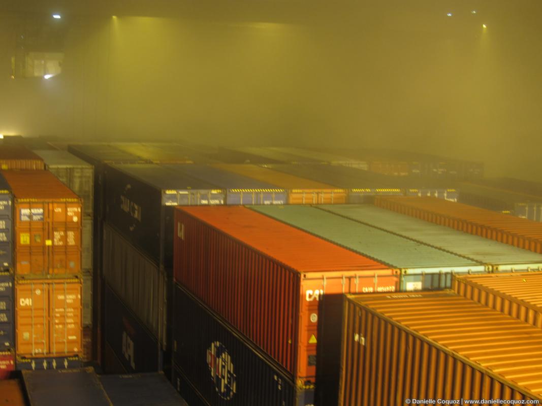 Il est quatre heure du matin, le NABUCCO, en route pour la Chine, fait halte à Southampton, courte escale pour embarquer de nouveaux containers. Depuis la passerelle nous assistons aux manoeuvres. Une brume toute anglaise nimbe les monstres de fer d'une douceur irréelle.
