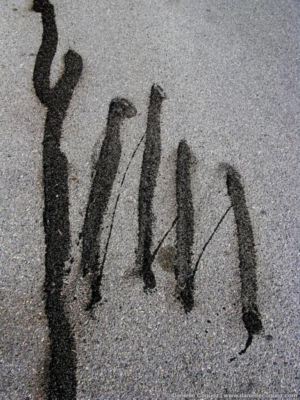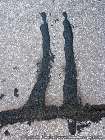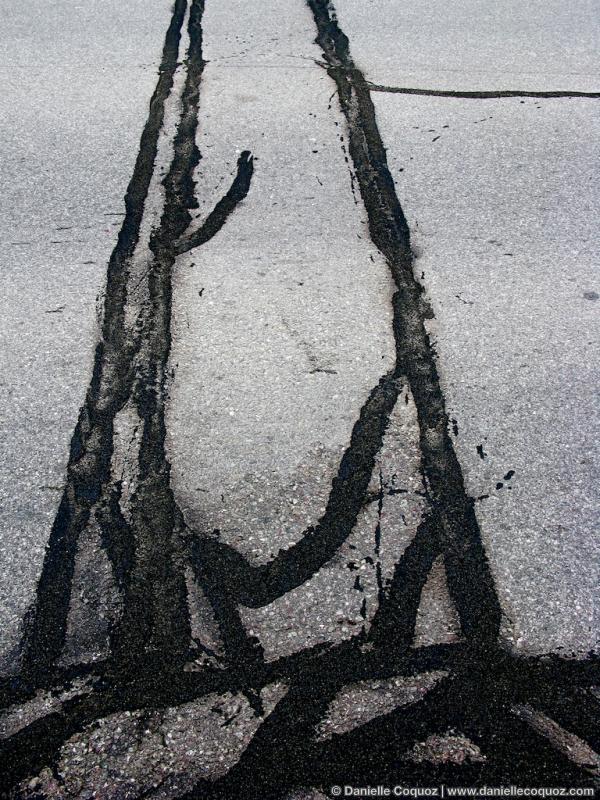 En hiver, sous l'effet du gel, la route craque et se fend. Au printemps, les cantonniers appliquent des pansements de goudron sur ces failles et ces trous. Ces réparations sommaires forment de mystérieuses inscriptions : écritures, signes cabalistiques, silhouettes.